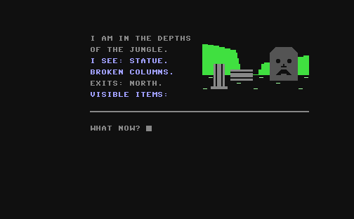 Welcome to Lost City adventure. While Softgold seem to produce games that lie in the "reality" realm, Mountain Valley love to make fantasy games (Lost City, Dark Planet, Mystery Island). Lost City is one of those ubiquitous treasure hunting games. The object is to collect 10 treasures scattered throught the 15-20 "real" locations and store them somewhere special. Basically this game is a "Mayan" version of "Mystery Island". This game also has two of the most nasty mazes I've come across in Interactive Fiction on any platform.